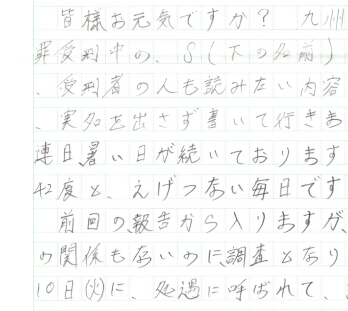 皆様お元気ですか? 九州O刑務所で、冤罪受刑中の、S(下の名前)です。今回は、受刑者の人も読みたい内容と思いますので、実名を出さず書いて行きますね。 連日、暑い日が続いておりますね。O刑は39度42度・・